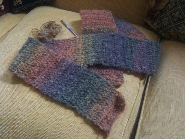 So I decided to watch a few YouTube videos on how to crochet so after about a week and some trials and tribulations I’ve been able to create a simple crocheted scarf. I found the yarn at In the Loop in Columbia and it is a beautiful Italian yarn that is 34% wool 26% kid mohair 34% acrylic 6% alpaca called Filtes King. Which I can’t even find online. The color shades really turned out nicely. The stitch is a basic double crochet and has really gotten me addicted. I still am enjoying using my knitting boards an looms but just might have to do some more crochet projects very soon. And don’t worry because crochet uses a hook and no needles 🙂