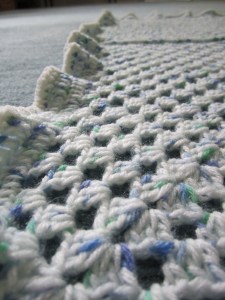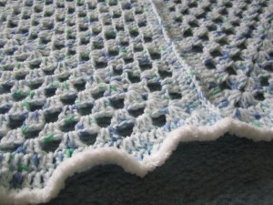 Here is a baby blanket I made for Briana’s baby who arrived yesterday evening 🙂  I made up this design with four large granny squares that were 15 rows wide, then did a single crochet joining stitch then used a different baby yarn for the final border.
