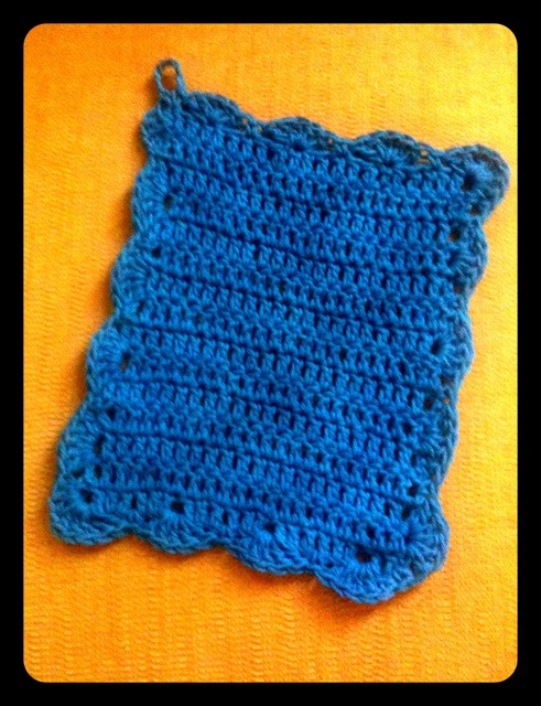 As you can see, this is a very plain and simple one hour dish cloth made from blue cotton yarn. It’s all double crochet stitch with a crude shell border 🙂