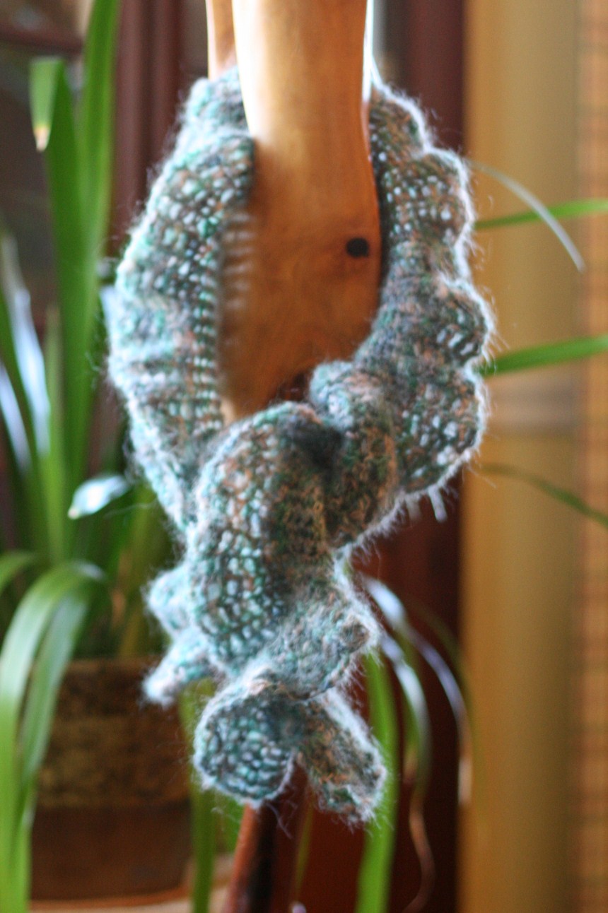 For this scarf I used Sundance Countryside yarn which is Acrylic/Mohair/Wool and used a simple ruffle pattern. It’s a modified version of the LoDo scarf pattern on Ravelry.