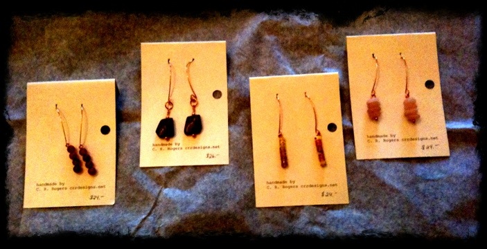 My first set of earrings that I made the ear wires for. I used 20 gauge copper wire and various beads. And yes, I used old library catalog cards to display them.