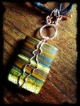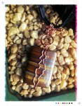 This pendant has beautiful browns and rust colors striped throughout the jasper and catches the light in different ways giving off different shades of colors. It is wrapped with copper and comes on an adjustable cord/ribbon necklace. The pendant measures close to 3 inches.