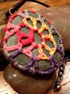 I started thinking about how I could combine my skills in jewelry making and crochet and have come up with thread lace crochet covered river stones. I think the multi colored ones and the beige ones are my favorite. The black doesn’t show up that well.
