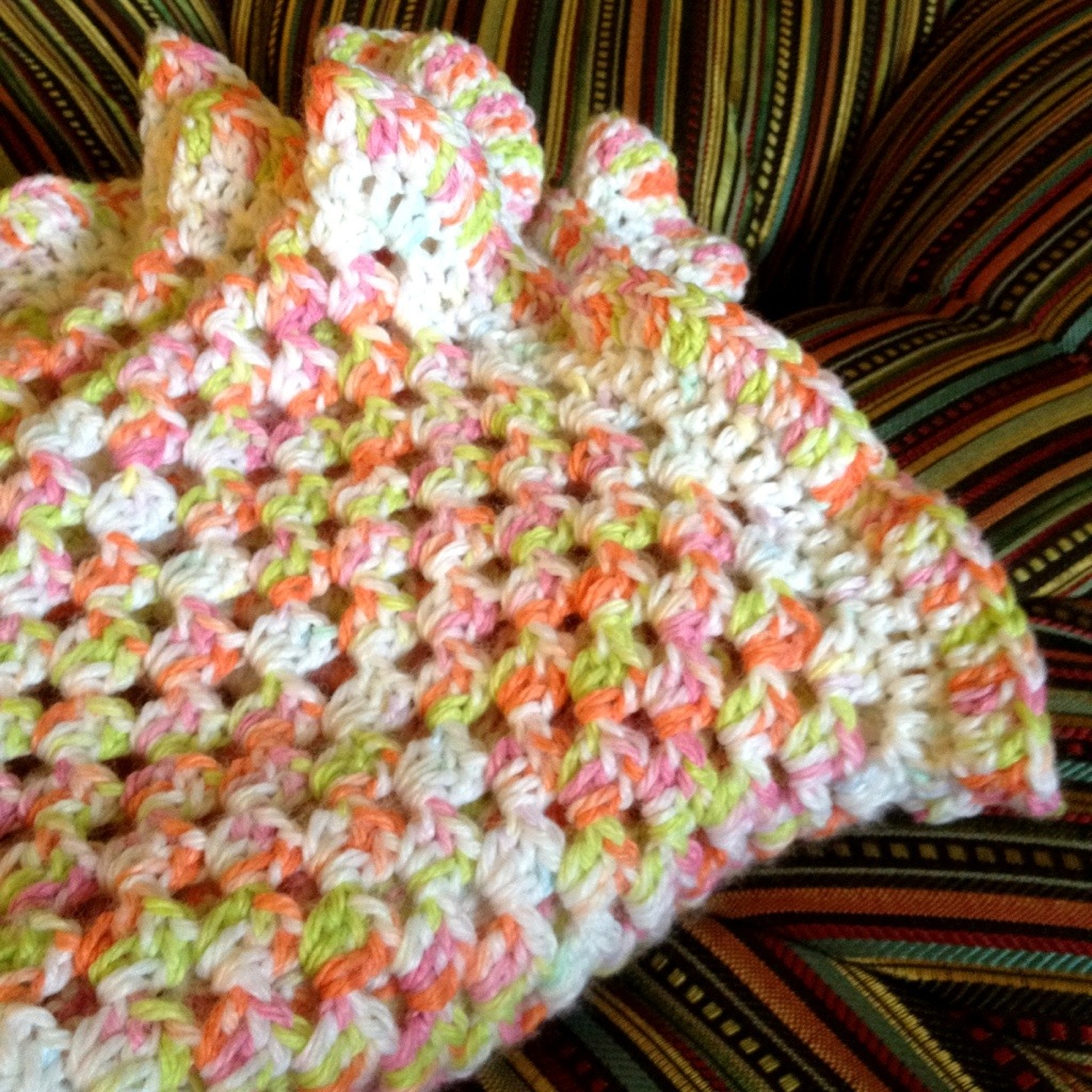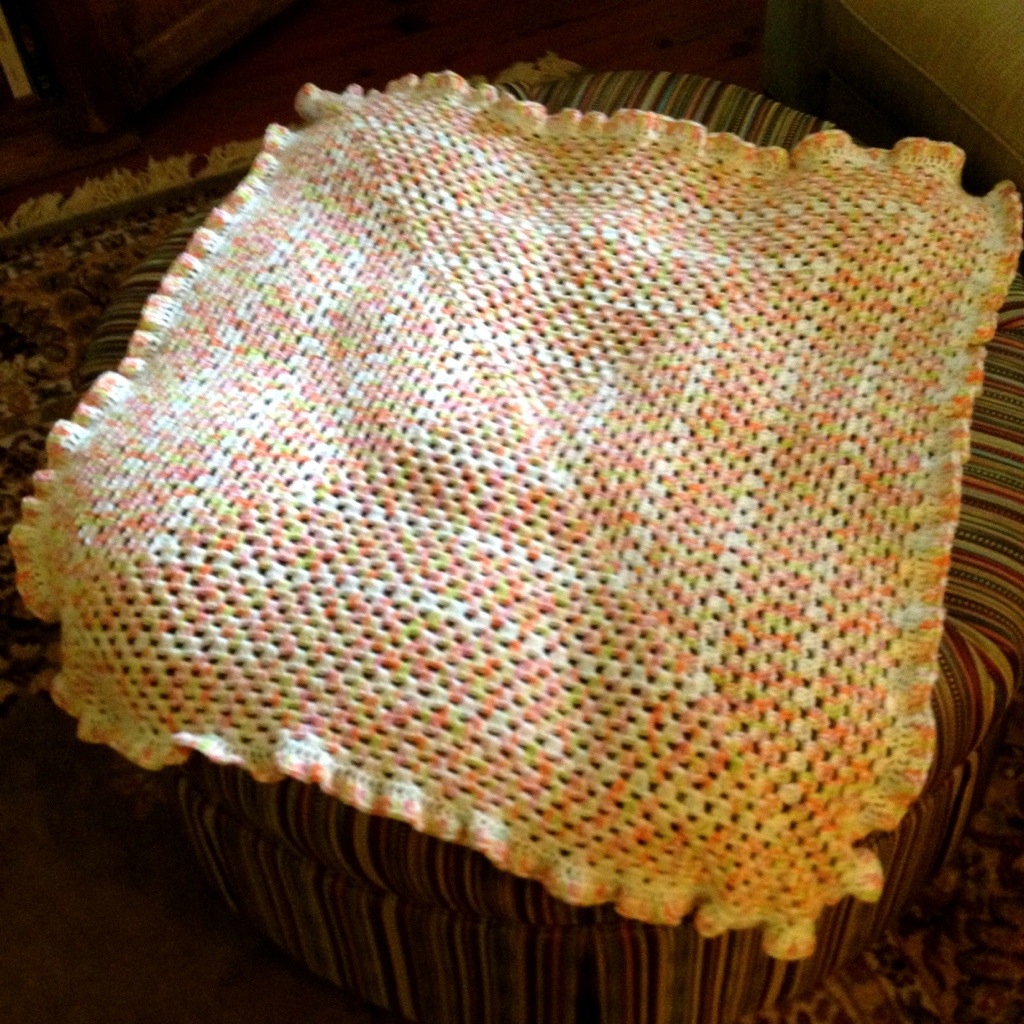 I made this baby blanket for a colleague’s baby shower. I used Bernat softee and a G hook. I added a simple dc ruffle edge and made it as a giant granny square.