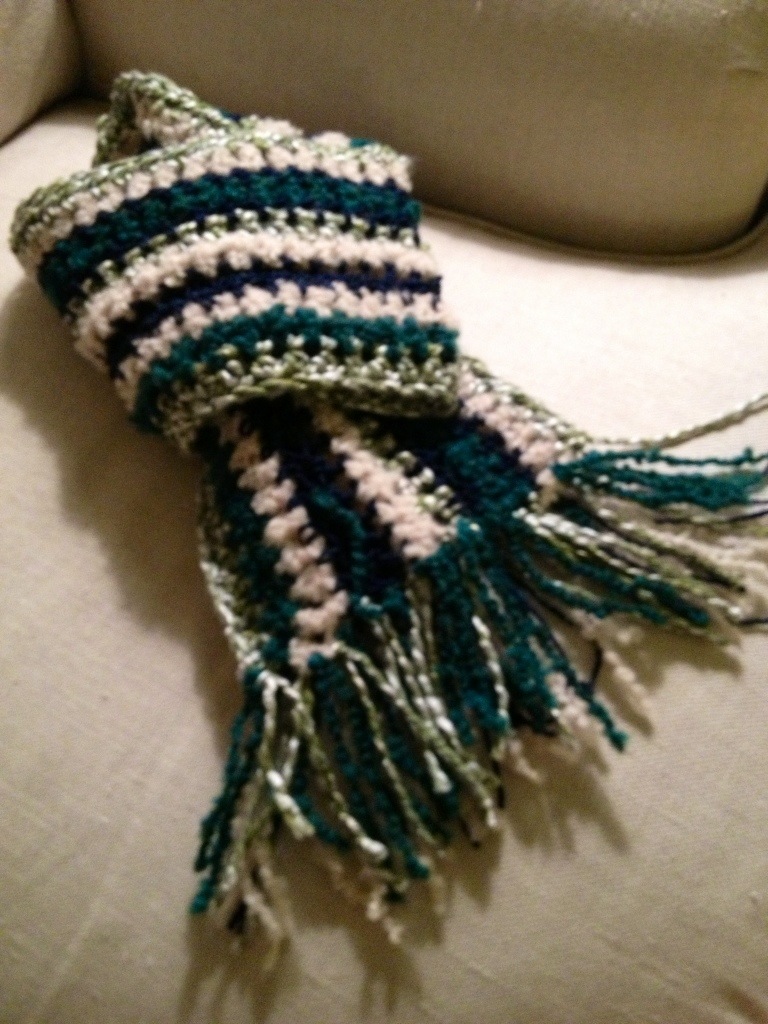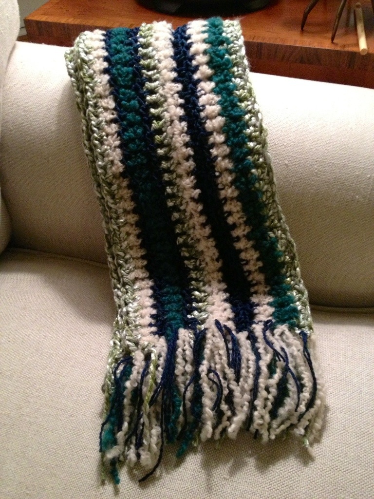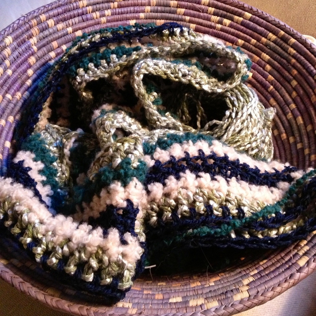This is a jumble of nylon, silk, cotton, merino wool, and microfiber. It turned very bumpy but soft from the sublime merino wool. See photos for yarns used. I also used a bamboo 8mm hook and the stitches are all half double crochet.