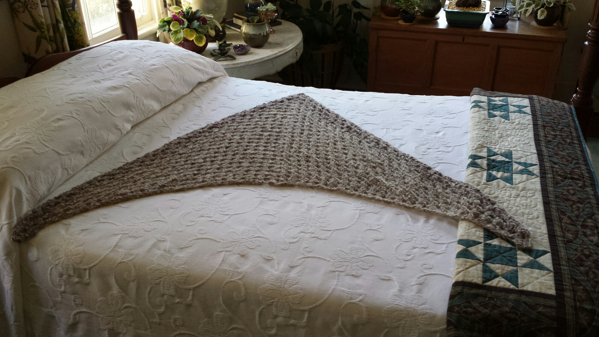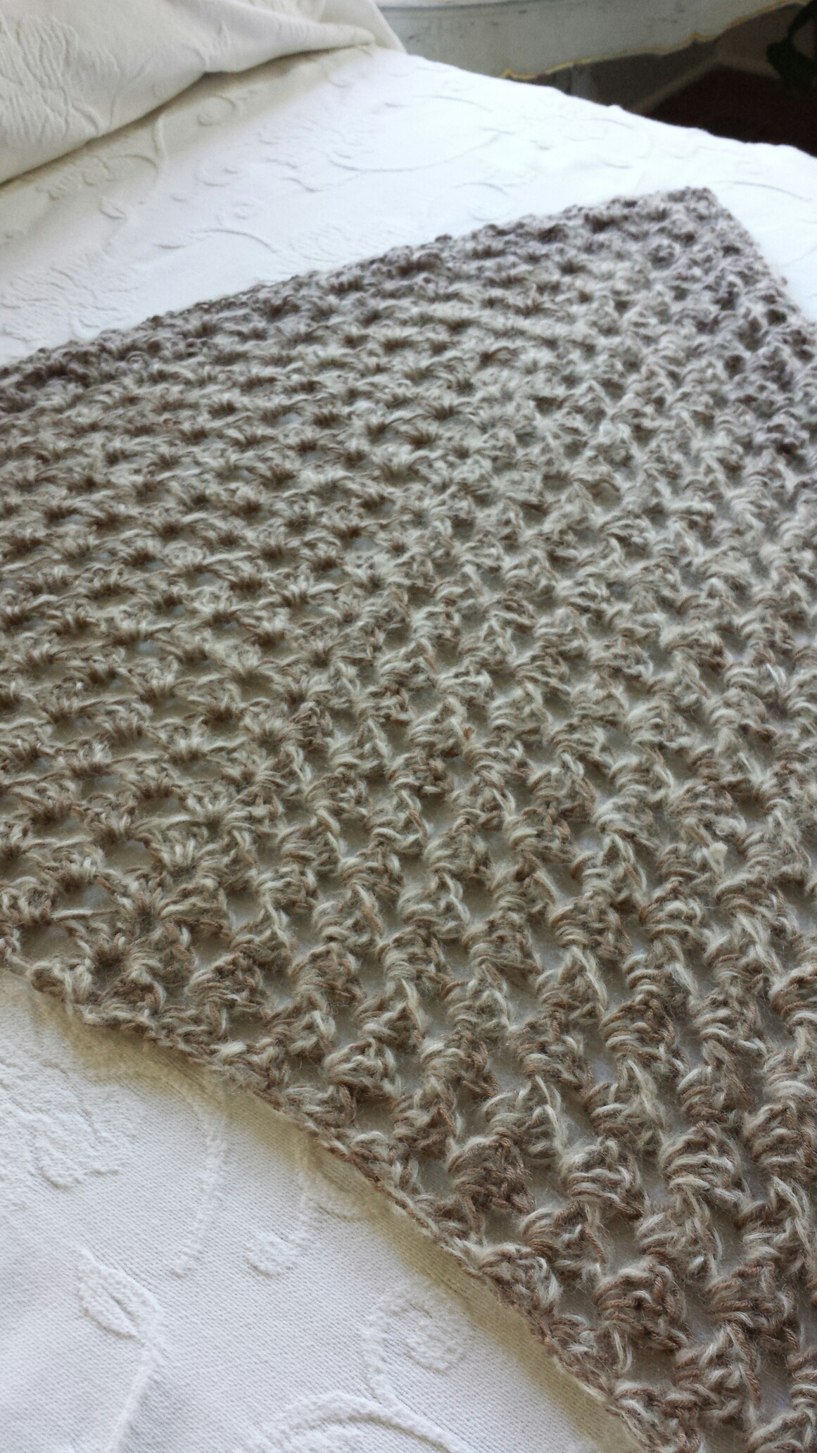 I made this mohair and bamboo silk shawl for a Christmas gift. It’s a basic granny square stitch and only took a few.days to make.