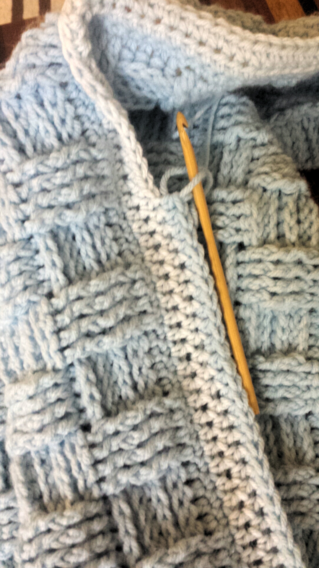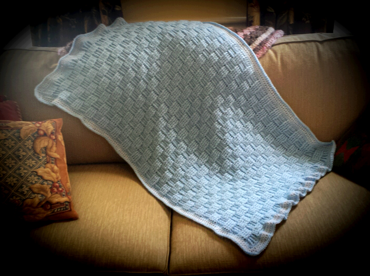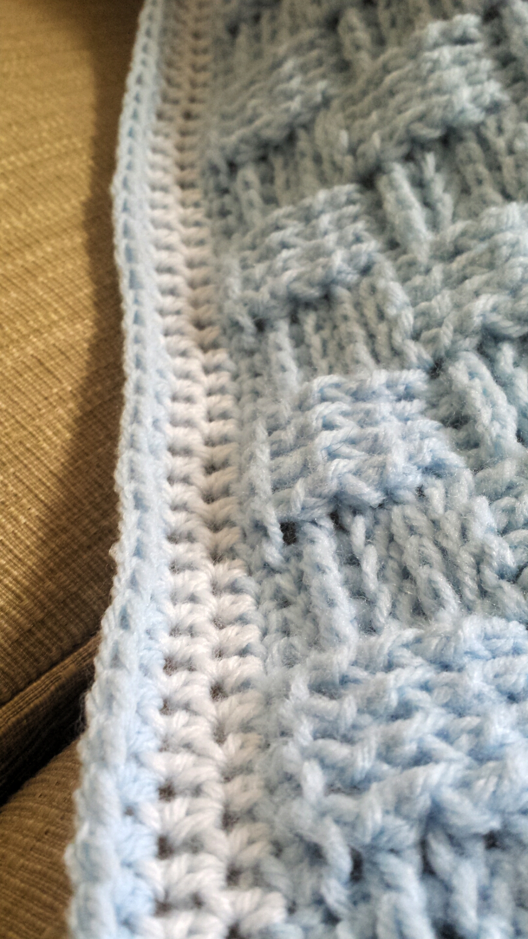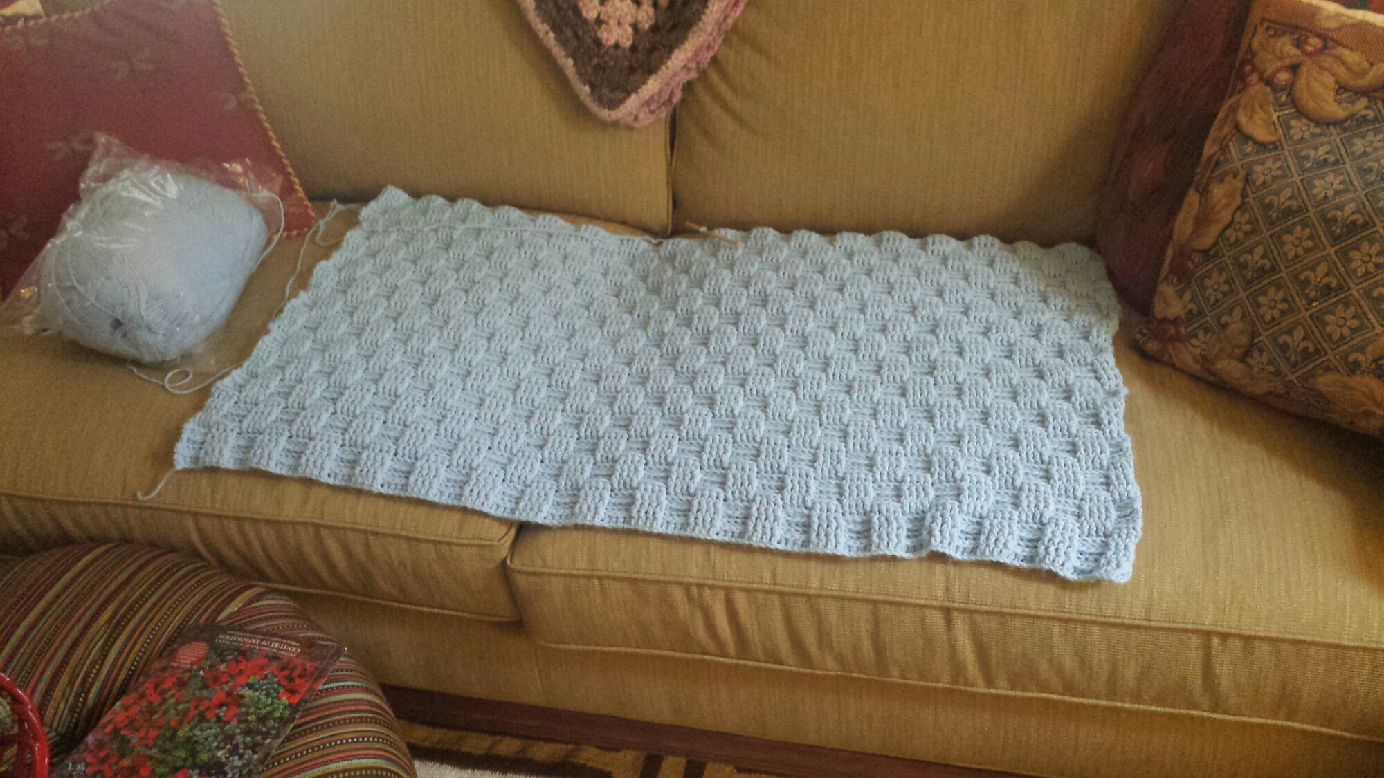 It only took me about two months of off and on working on this crib sized baby blanket. I did not use a pattern. Instead, I just used a basic basket weave stitch in basic acrylic yarn. The border is a very light blue in a half double crochet stitch. I hope it lasts for years to come 🙂
