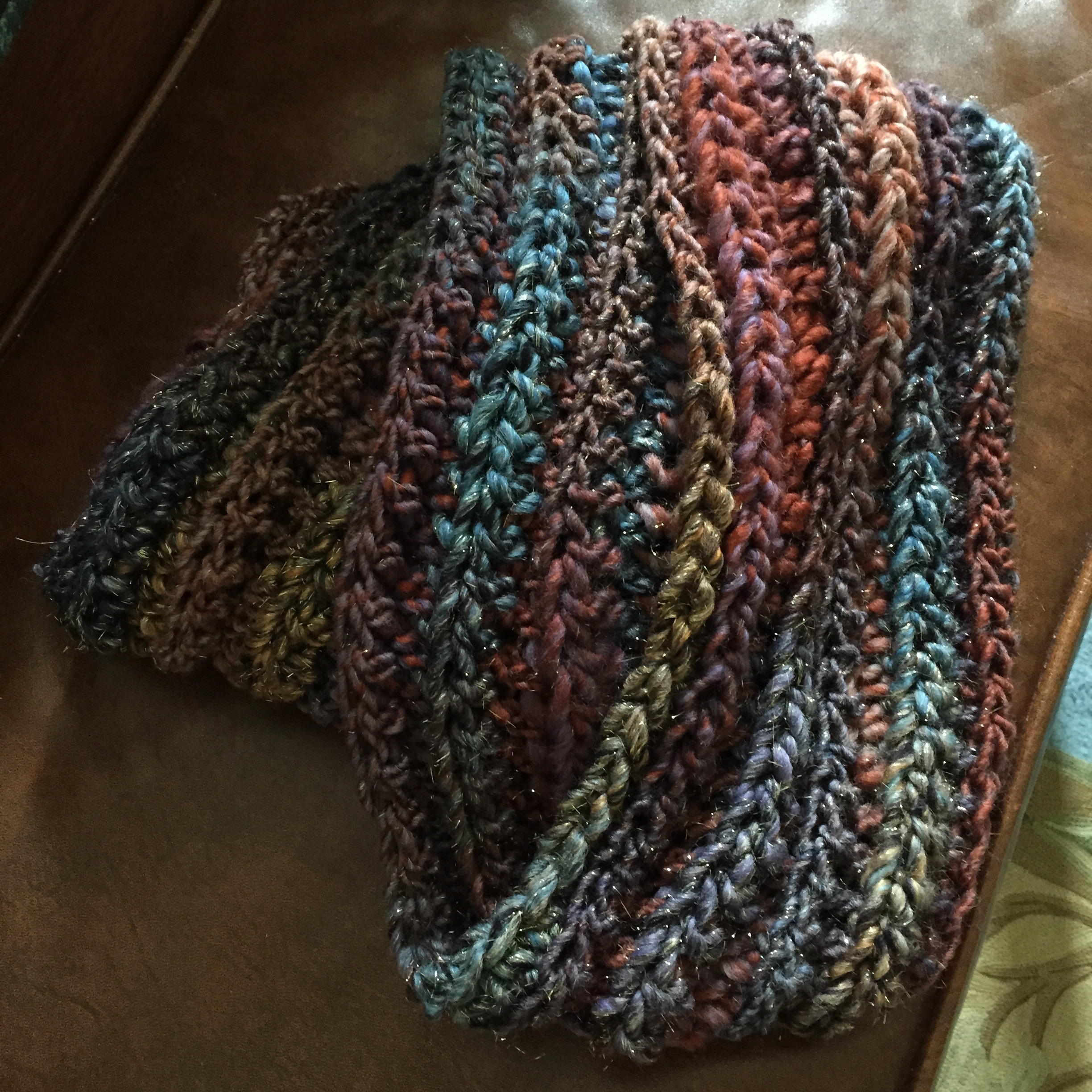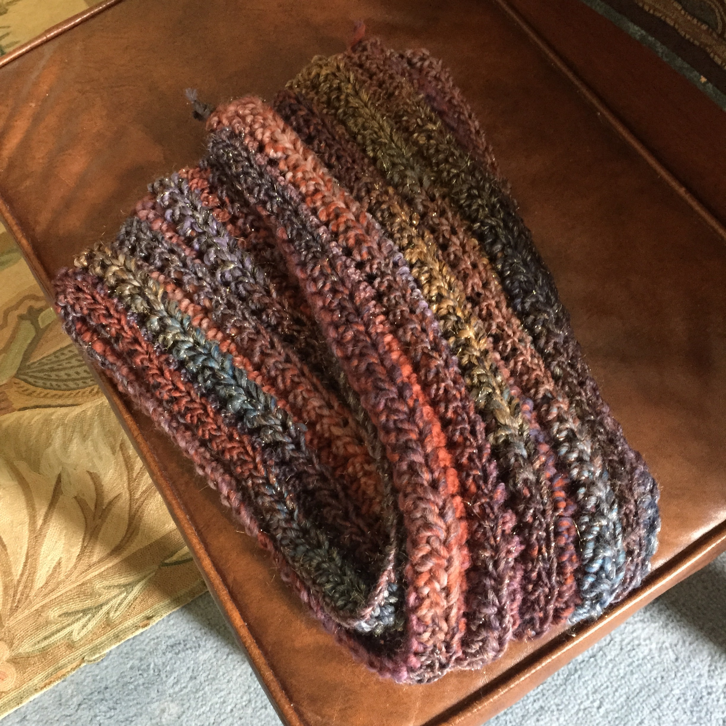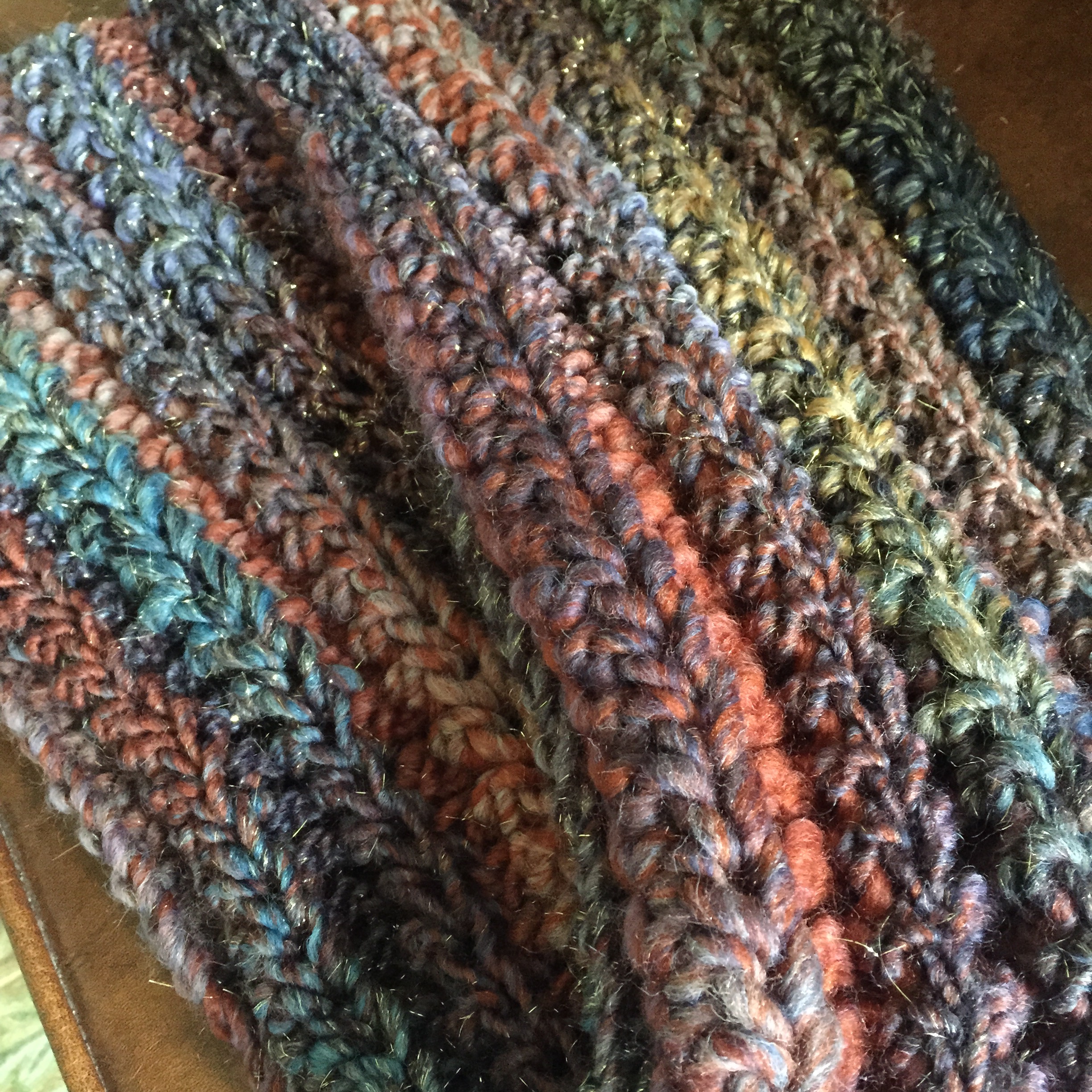 Made this colorful scarf using Berroco Brio chunky yarn. It sold at a silent auction for $45!  It’s a basic half double crochet stitch.