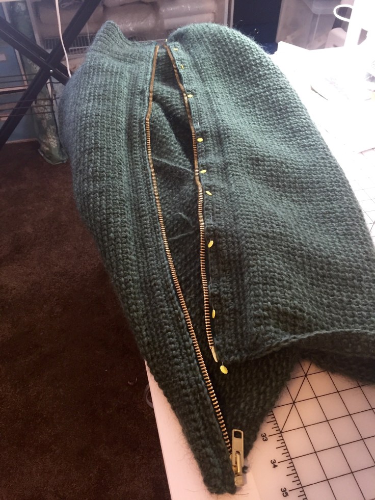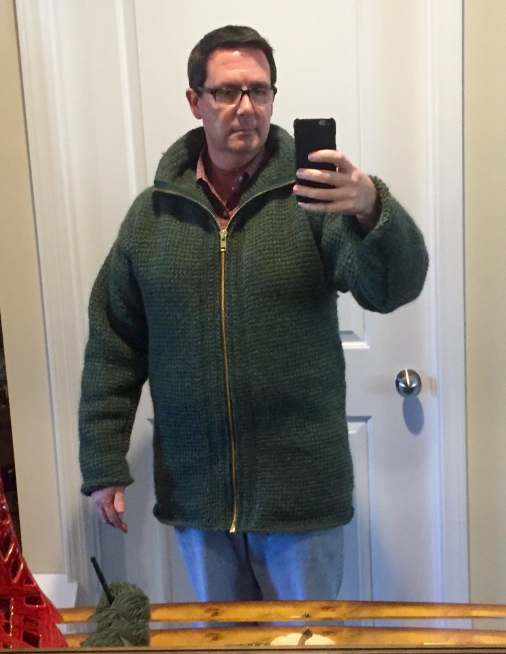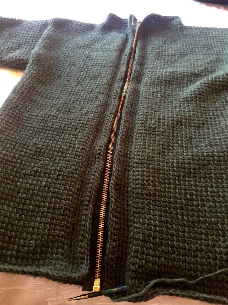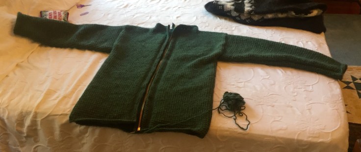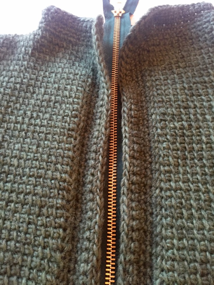 Well it’s been about two months, but I’ve finally finished my first sweater! And I think it turned out really nice! I use green Lopi wool (took about 11 skeins) and the zipper is brass that my sister sewed in for me. I used a free Ravelry pattern that is called Tunisian Rib Stitch Zip Front Cardigan by Treva McCain. You can download it here for free. However, I only used the basic shapes and sizes from the pattern and made the collar larger to fit the zipper I bought online which was 34 inches. I also used a size K tunisian crochet hook. I’m really happy with the way it turned out!