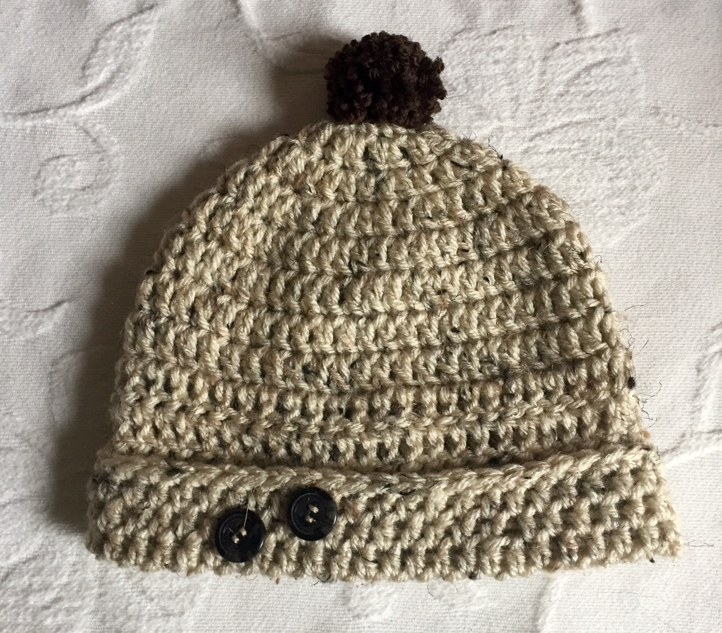 This is a girl’s hat for ages 1 to 2 years old with two small buttons. I adjusted this pattern by using a 5 mm hook instead of a 5.5 mm hook.