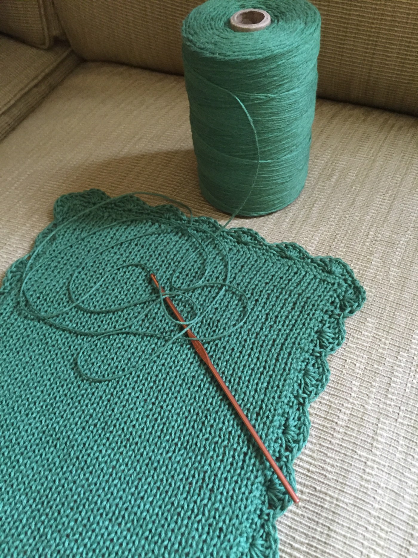 This is the second dish cloth that I have made on the knitting machine. I used Maysville carpet warp and the color is myrtle green.  I knitted 60 rows on 40 hooks. I decided to set the tension at three and like it a lot better than the previous dish cloth tension setting which was 6. I crocheted the edging with a size D metal crochet hook in a shell stitch pattern.