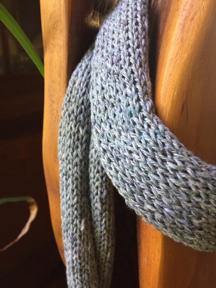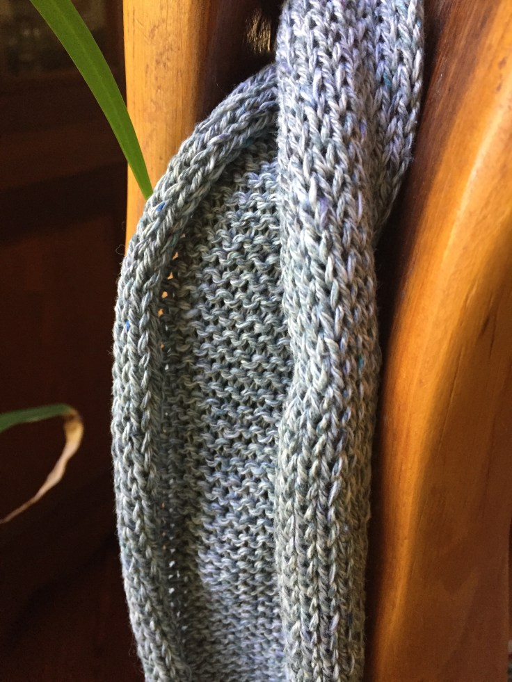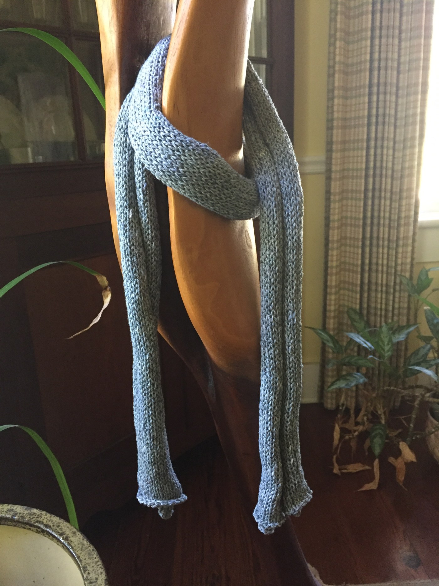 I found some sale yarn I bought months ago and thought I’d try it on my knitting machine. The result? A great little summer scarf. Here’s a description of the yarn:
