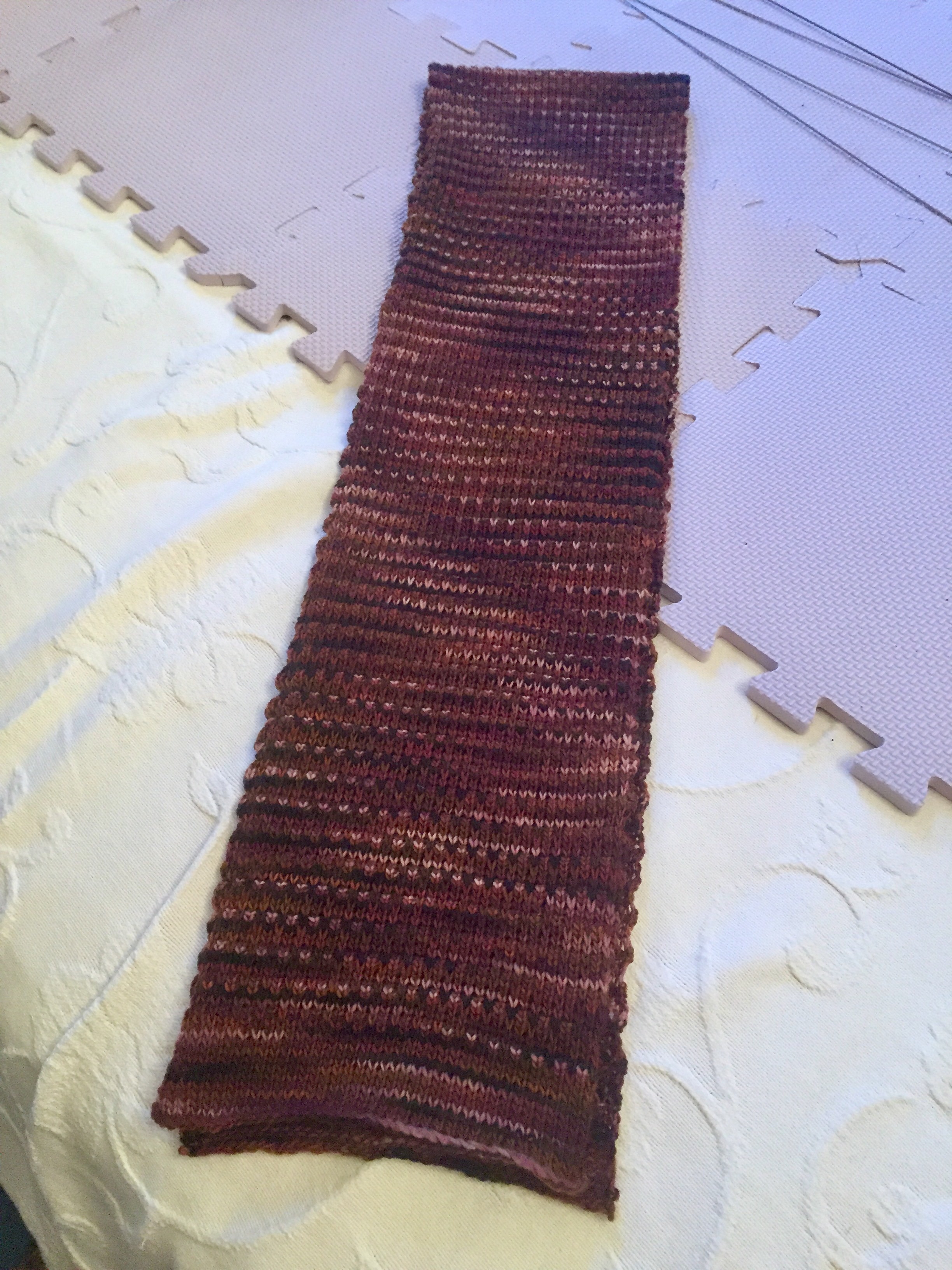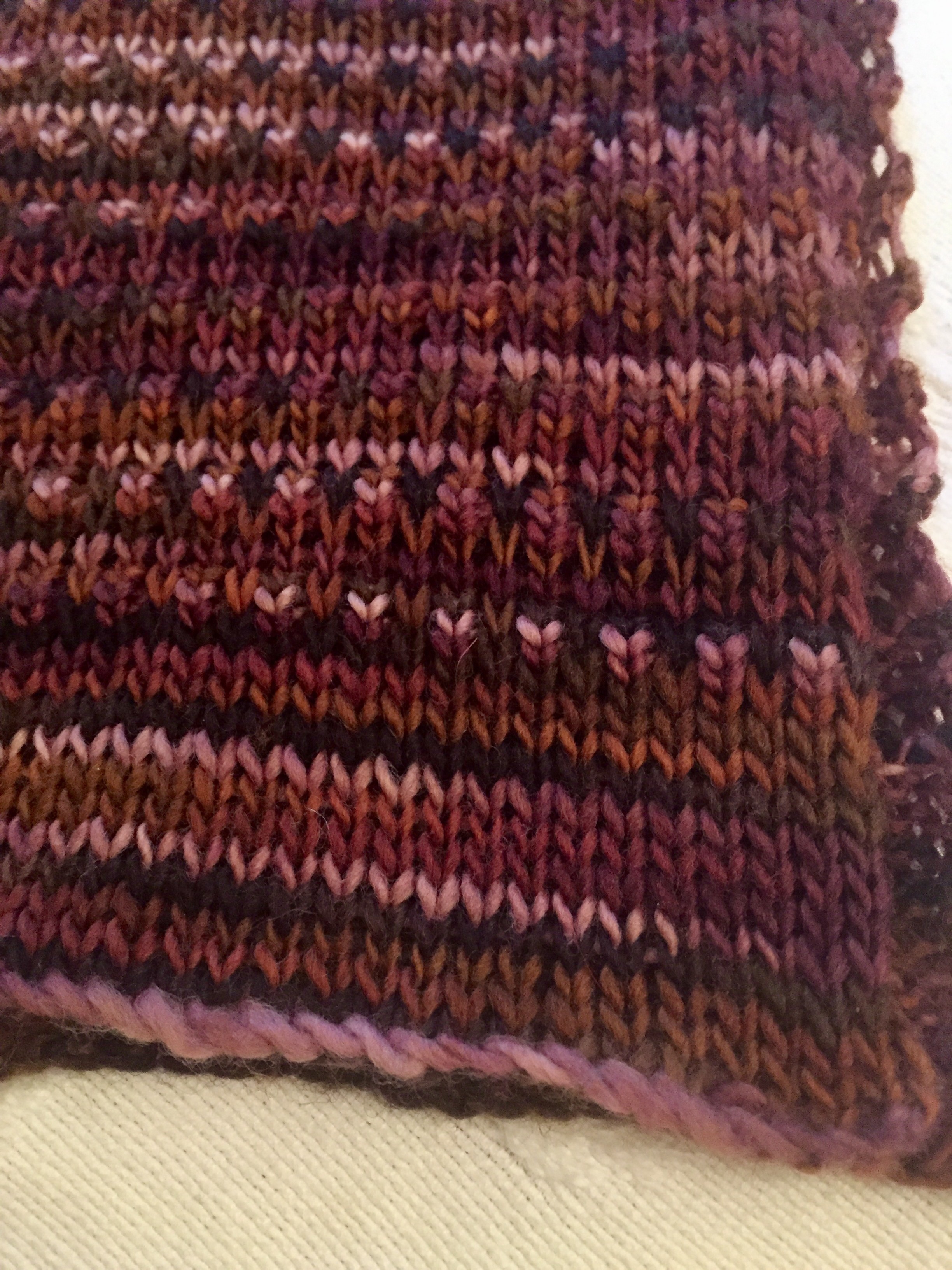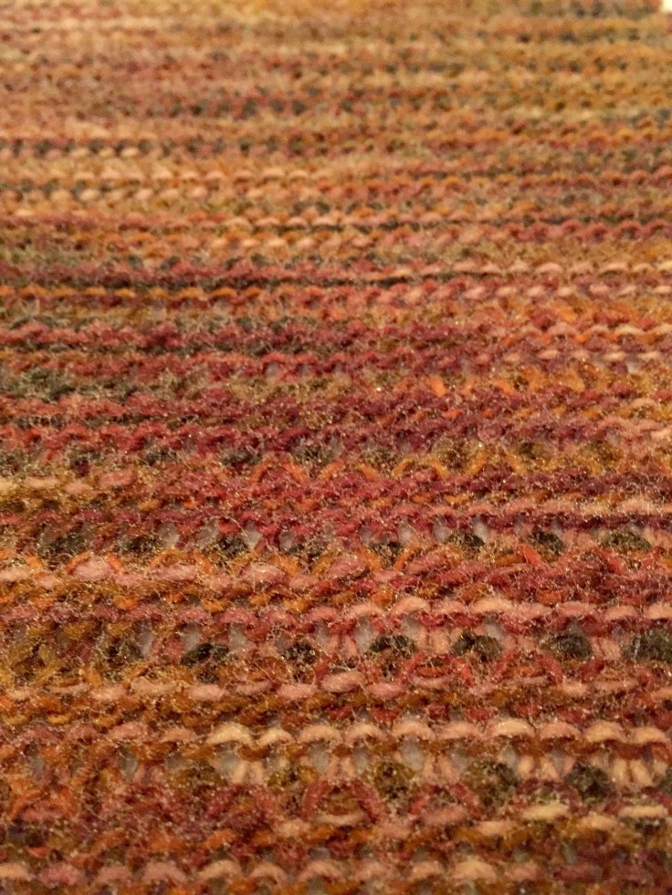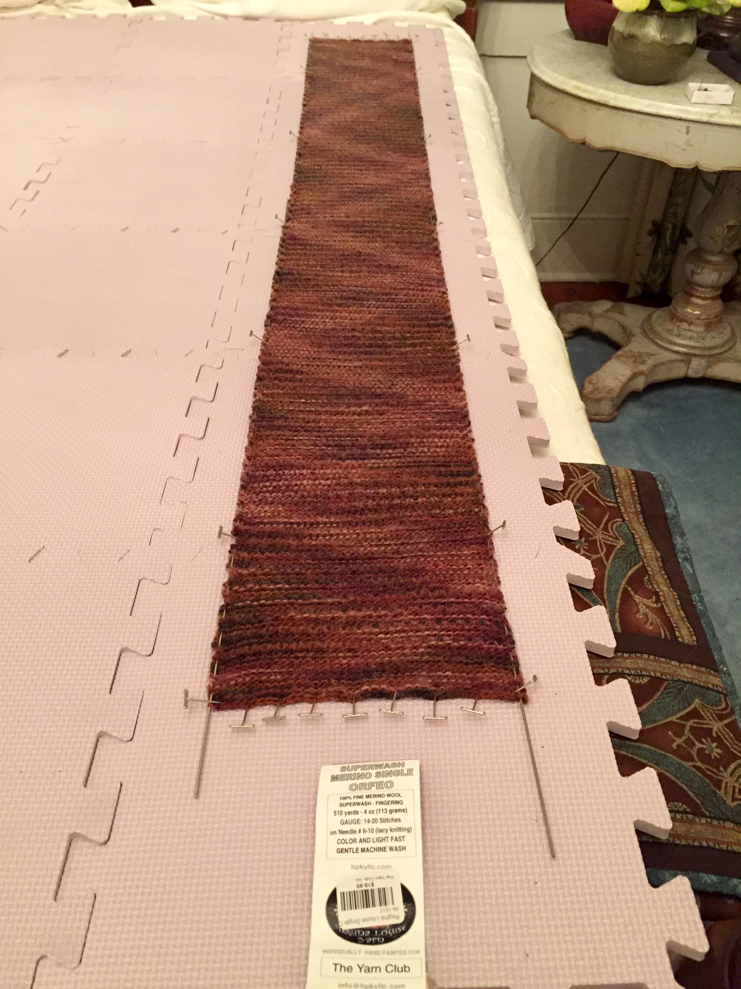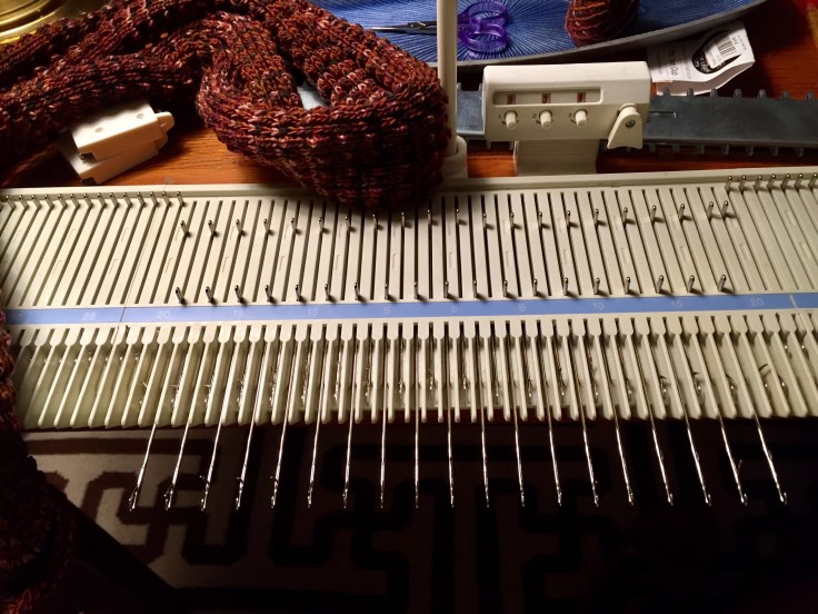 I decided to try a different tuck stitch pattern and used every other needle on the machine. Look through the pictures and you can see the various stages of its development from blocking to being finished.