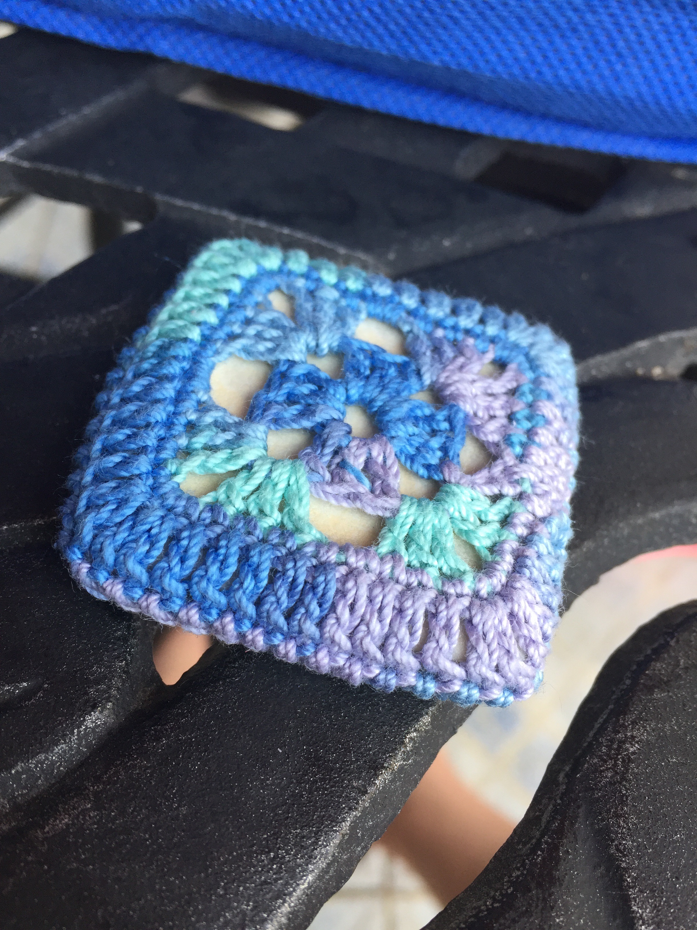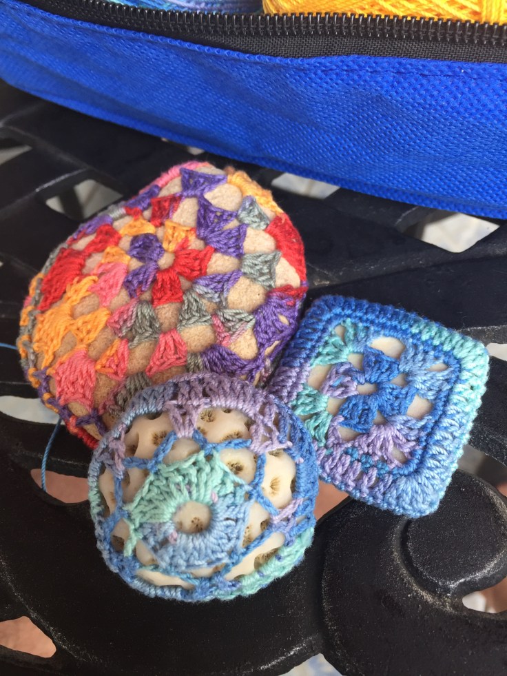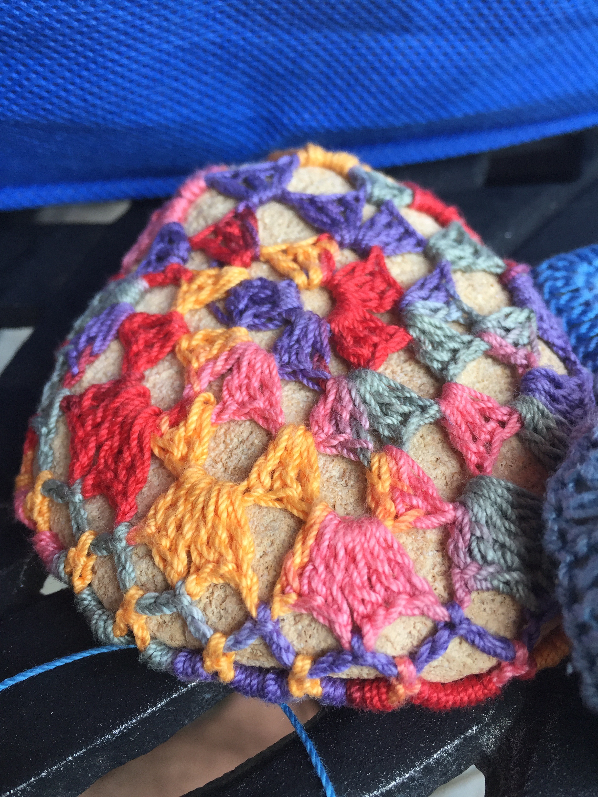 I love to sit near the beach and find stones and coral to cover with thread. No patterns. Just fun.