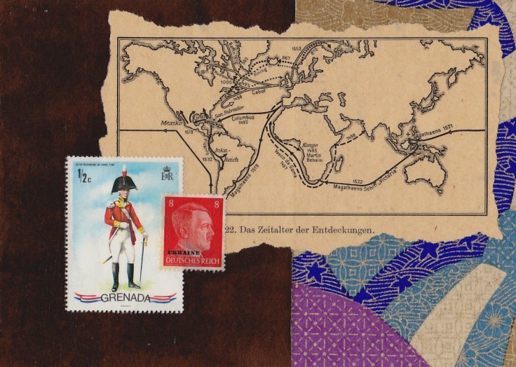 The Age of Discoveries – 2017, 5×7, Collage on canvas board. Yuzen Chiyogami Washi Origami Paper, postage stamps, book image