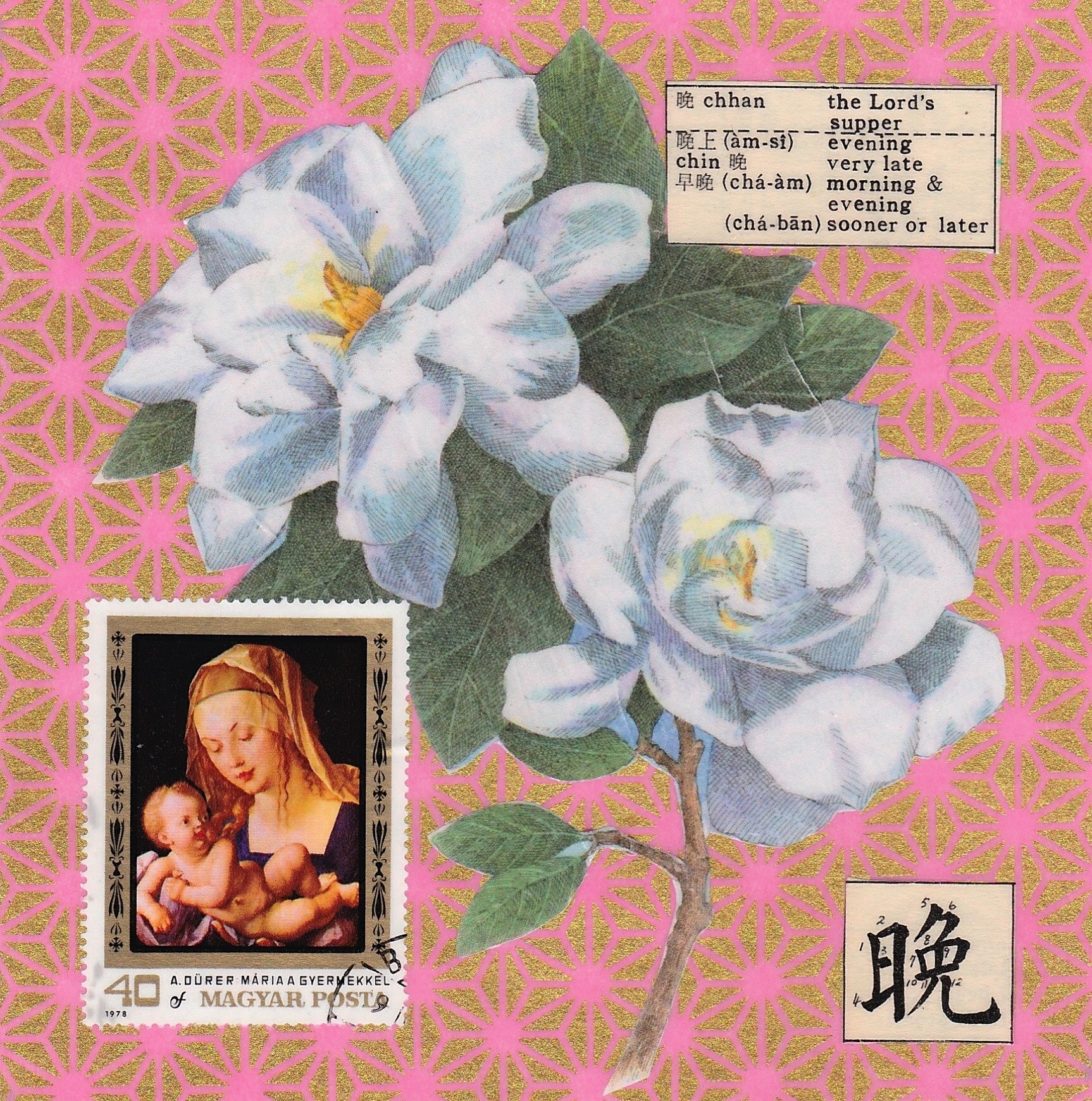 The Lord’s Supper – 2017, 6×6, Collage on canvas board. Yuzen Chiyogami Washi Origami Paper, postage stamp, magazine image
