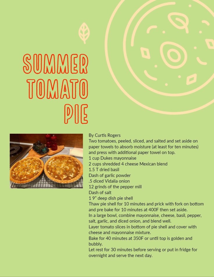 1. Curtis, your tomato pie recipe looks yummy, and I’m not even a fan of them!! If you need more tomatoes, we still have a few left from Walker’s 4th of July visit plus need to return Dick’s cookie tin so send him over!!