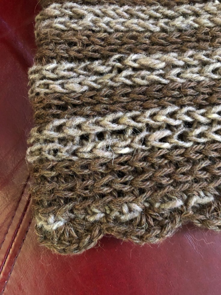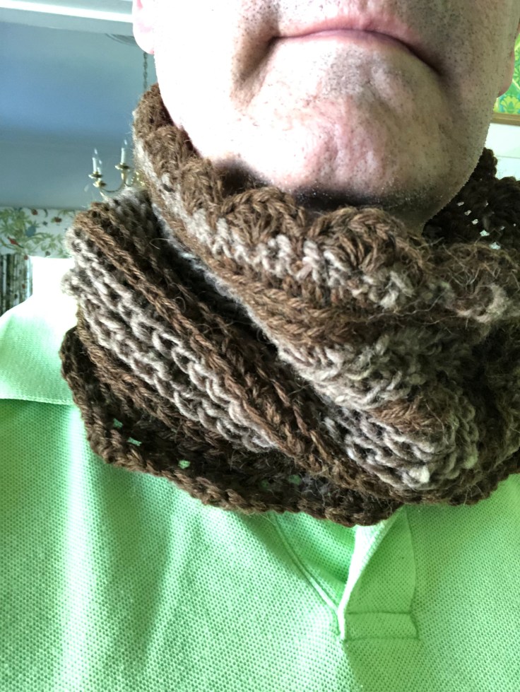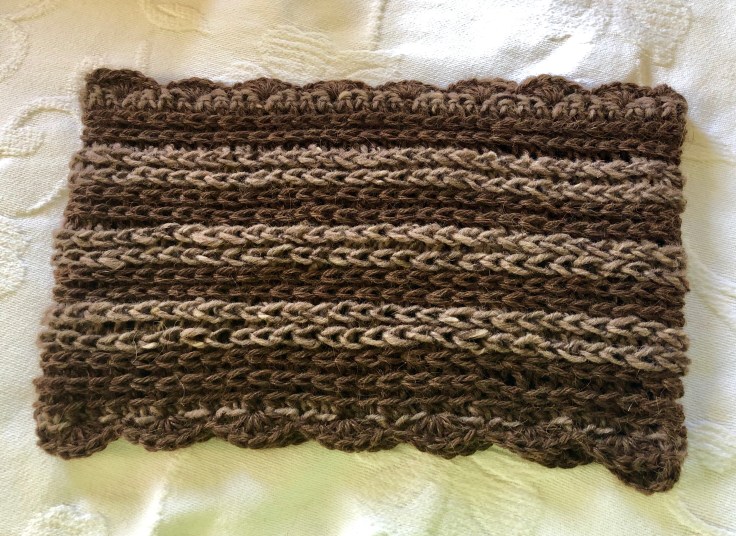 Materials, approximately 50g of Aran weight Irish wool, approximately 50g of worsted weight Peruvian llama yarn, a 7 mm, 6mm, and 5mm crochet hook.