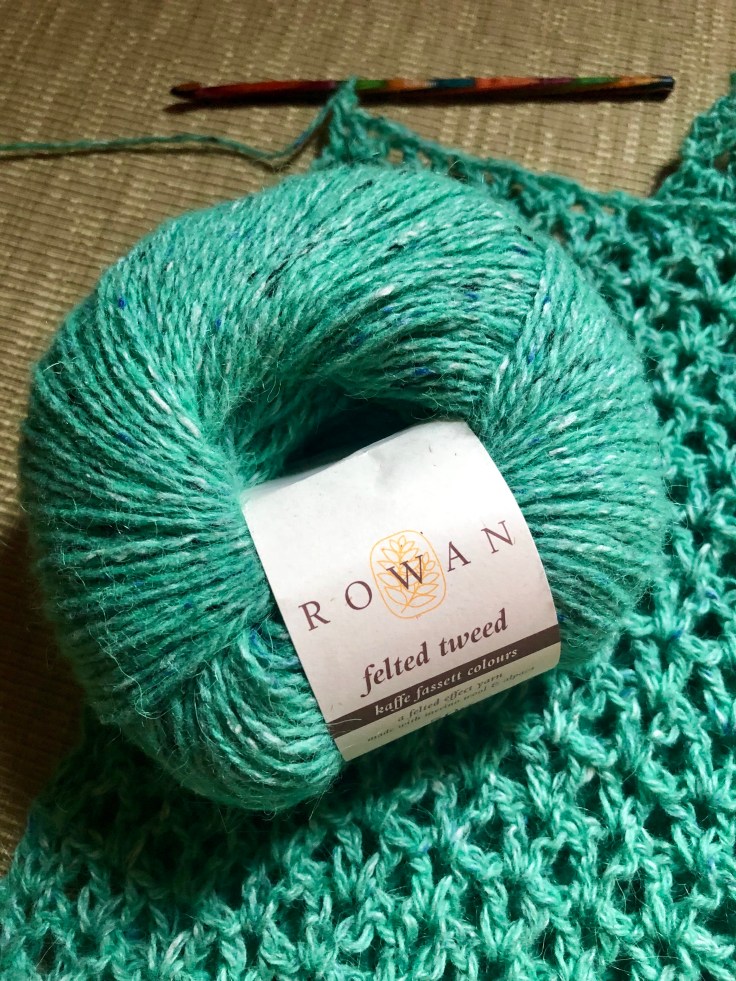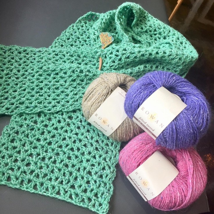 I was pleased to share this scarf with the staff at Luna Lola and the have it on display in the store! I used two skeins of this really nice Rowan felted tweed and a basic V stitch with an H hook. And I even blocked it!