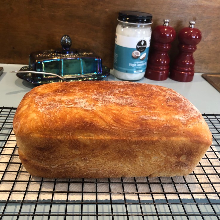 Fold dough on floured board then proof again in greased towel-covered bread pan for 1 hour. Then an additional 30 minutes while oven preheats at 425F.