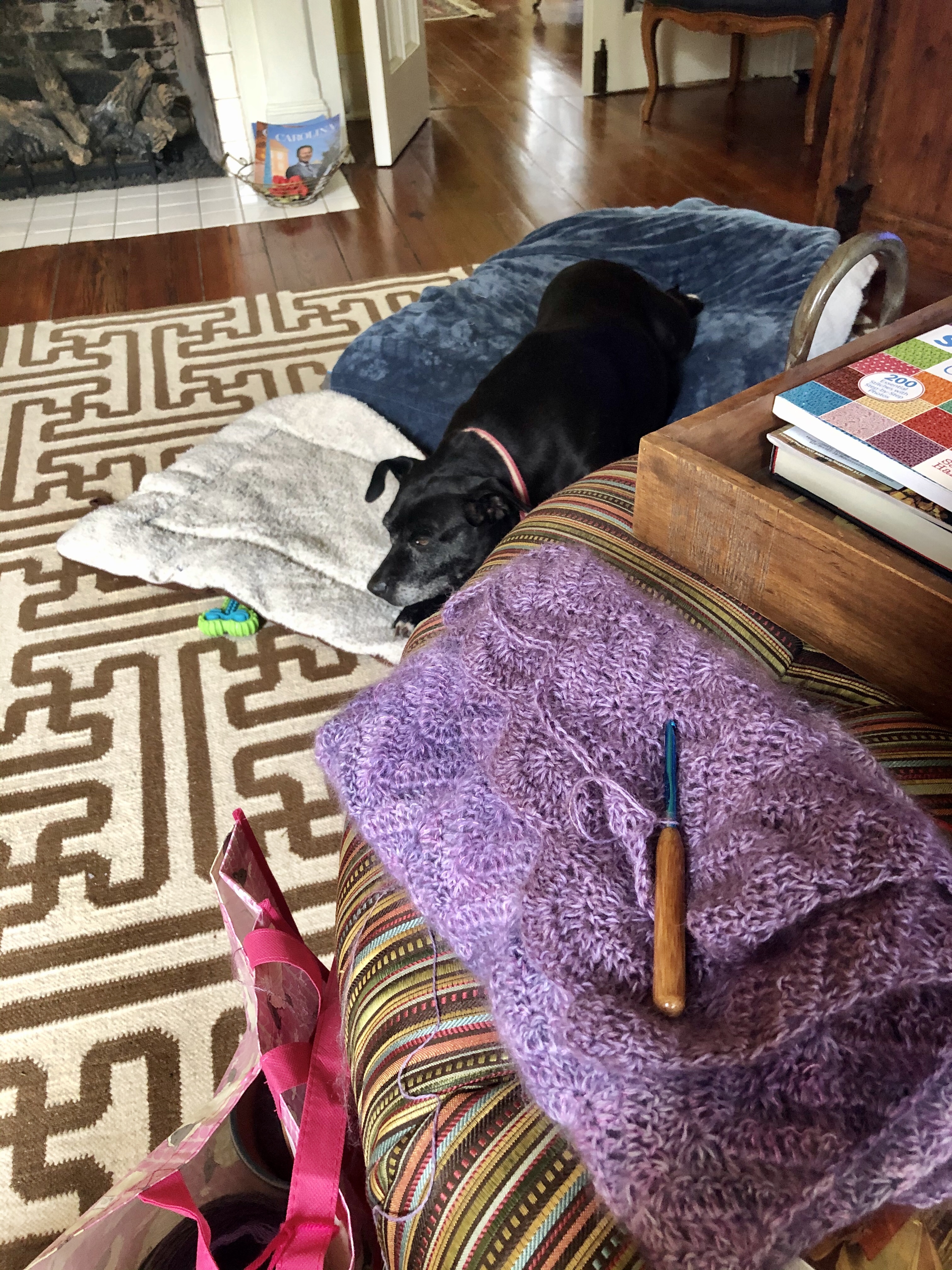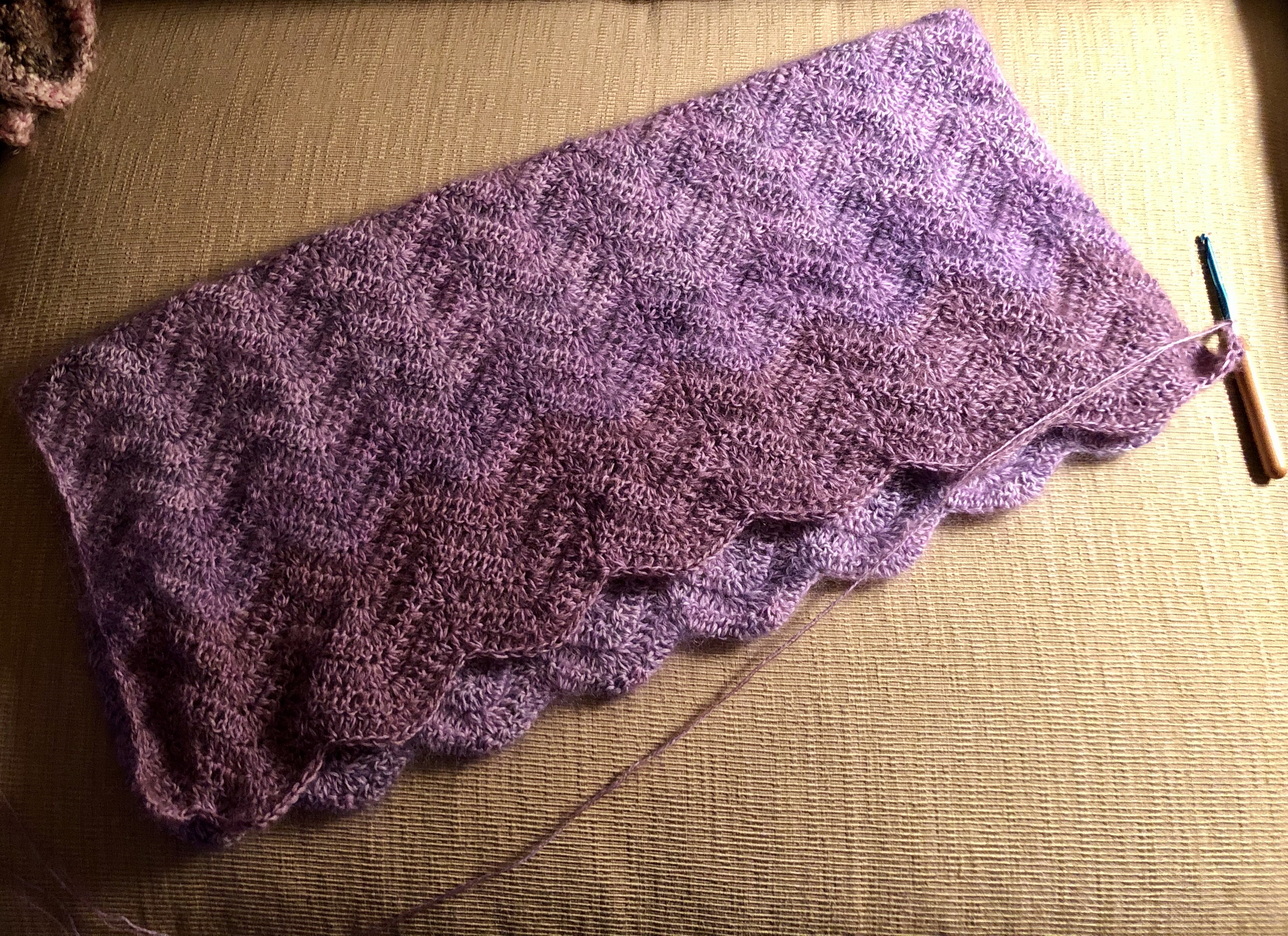 I am happy to report that I have finally finished this mini Afghan. I used three different yarns. I used the Queensland wool and cotton blend that was 1500 yards and came in four colors in one cake. Then, I used a mohair and silk blend from Orion fiber arts from New York and then when I ran out of that I used Rowan kidsilk haze. Therefore this turned out to be a huge mishmash of similar colors but it is incredibly soft and will be great to have around on cold winter evenings. I would never use the Queensland cotton blend again because it constantly bunched up and was difficult to work with especially when you are trying to crochet with two strands together.