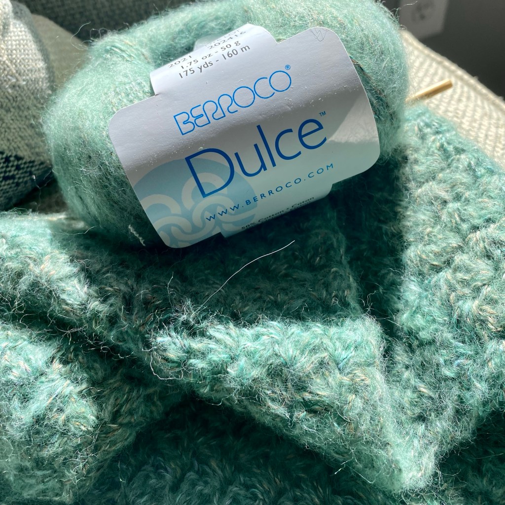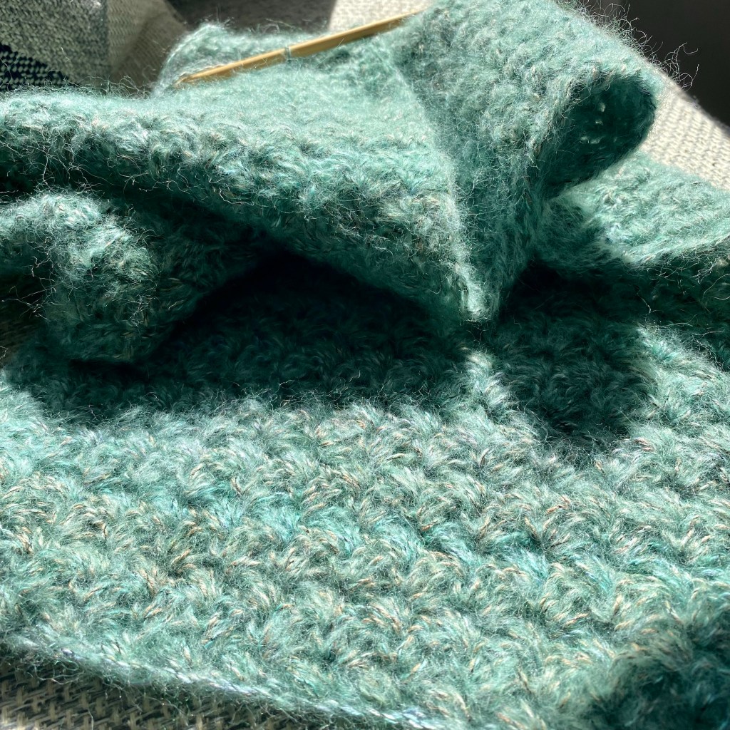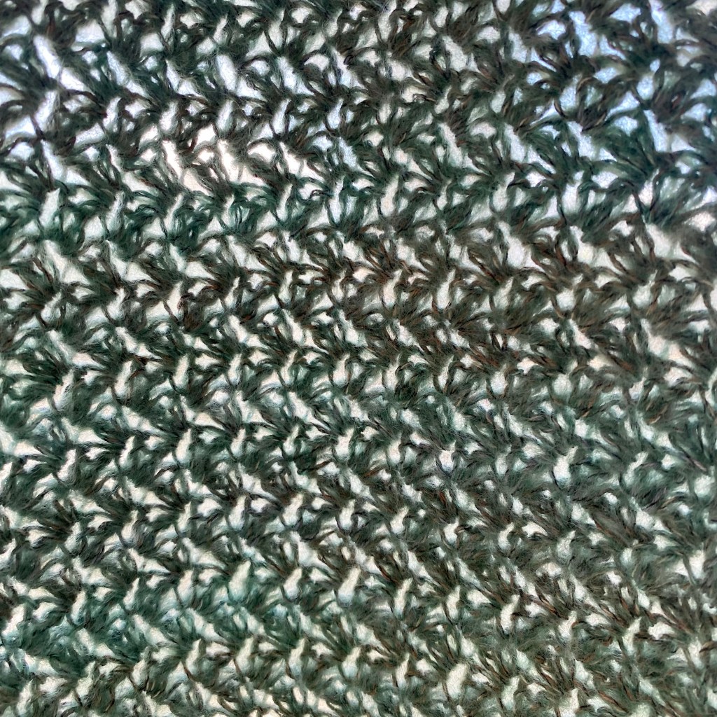 This is a crocheted scarf using the Suzette stitch and Dulce yarn by Berroco. It’s incredibly soft and I’d definitely use this yarn again. You can really see the stitch pattern when you hold it up to the light.