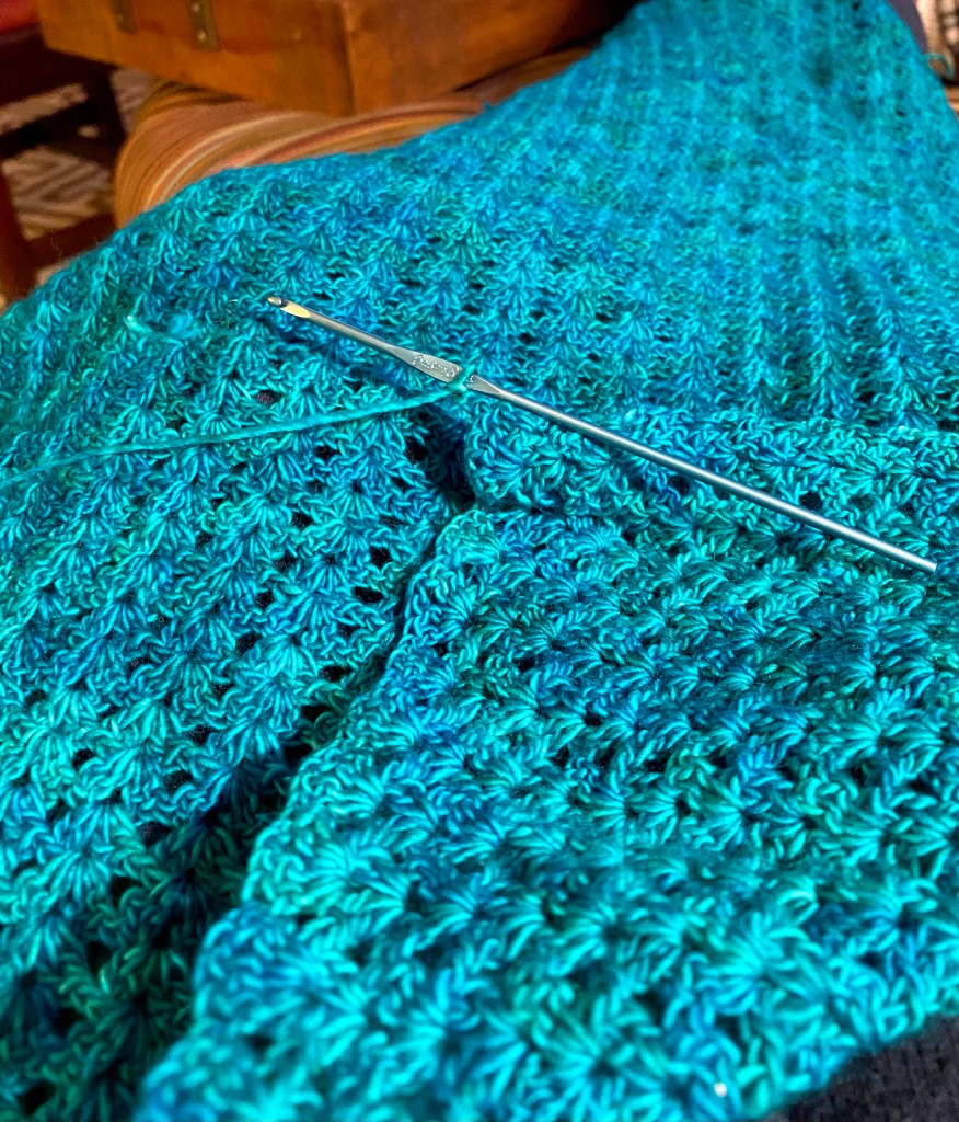 These are my favorite colors! Blues and greens like the Caribbean ocean. I found this Madeline Tosh merino light yarn and ended up using three skeins (1260 yds) for this scarf. It’s in an iris stitch and I used a 2.75mm hook. After blocking it I have to say that it’s got a wonderful drape to it!