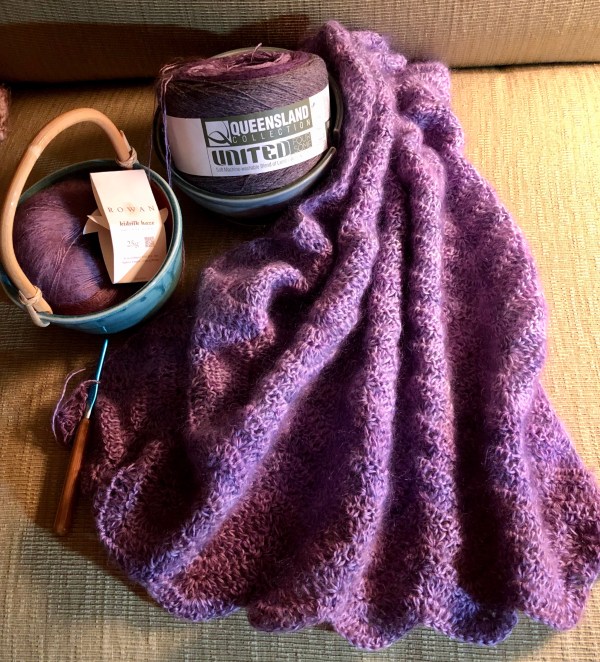 I am happy to report that I have finally finished this mini Afghan. I used three different yarns. I used the Queensland wool and cotton blend that was 1500 yards and came in four colors in one cake. Then, I used a mohair and silk blend from Orion fiber arts from New York and then... Continue Reading →